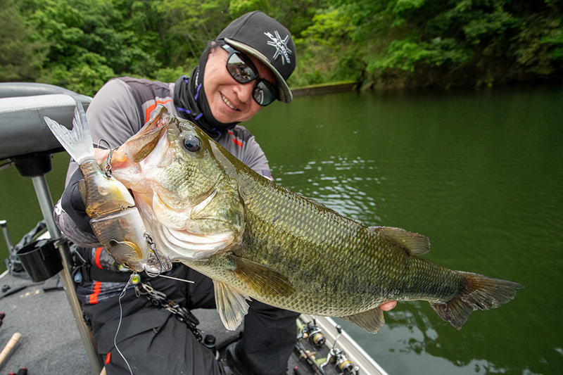 首振りサーチの線の攻めの中に、ここぞという場所ではじっくりスローに粘れて、見せて襲わせることができるビッグベイト。一発の水押しパワーと移動の短さはフラットサイドならではです。
